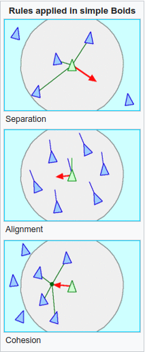 In 1986 Craig Reynolds simulated the flocking behaviour of birds. He came up with a simulation of so called “boids” that get controlled by 3 simple rules Each rules takes in concerne the boids close to it self.